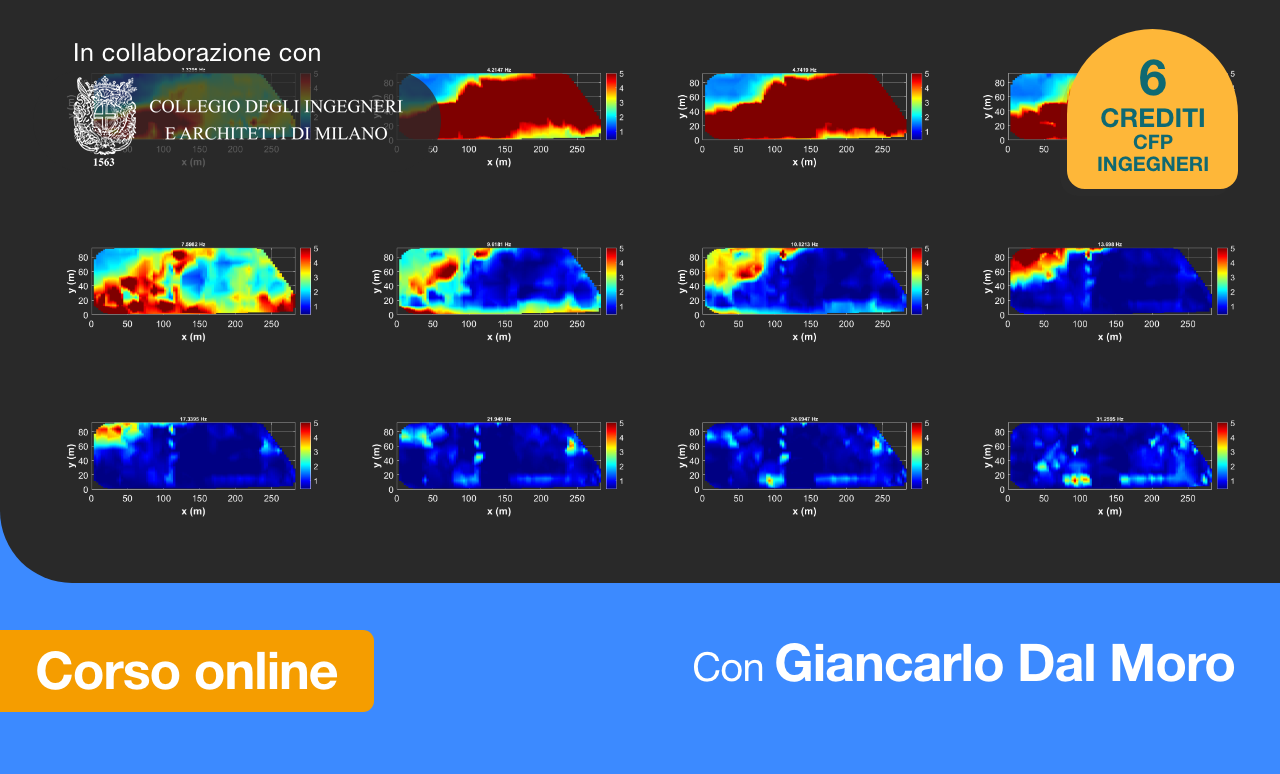 Rispetto ai webinar precedenti, questo laboratorio avrà un taglio spiccatamente pratico: si daranno per acquisiti gli aspetti teorici trattati nei tre libri pubblicati per Dario Flaccovio Editore (e illustrati nei corsi precedenti). Per questo motivo, ribaltando le consuetudini, la prima parte sarà dedicata alle domande dei partecipanti su aspetti teorici pertinenti agli argomenti trattati. Successivamente, si passerà all’analisi diretta dei dati, spaziando tra vari obiettivi e tecniche: dai dati vibrazionali registrati su un ponte e in un edificio, all’analisi ESAC multi-componente 1D, passando a HoliSurface® con dati acquisiti sia con sistemi tradizionali a cavo sia con nodi sismici, fino alla ricostruzione di sezioni 2D delle Vs mediante la tecnica 2D-SuPPSALA, basata sull’elaborazione di dati passivi multi-componente raccolti lungo un array lineare.